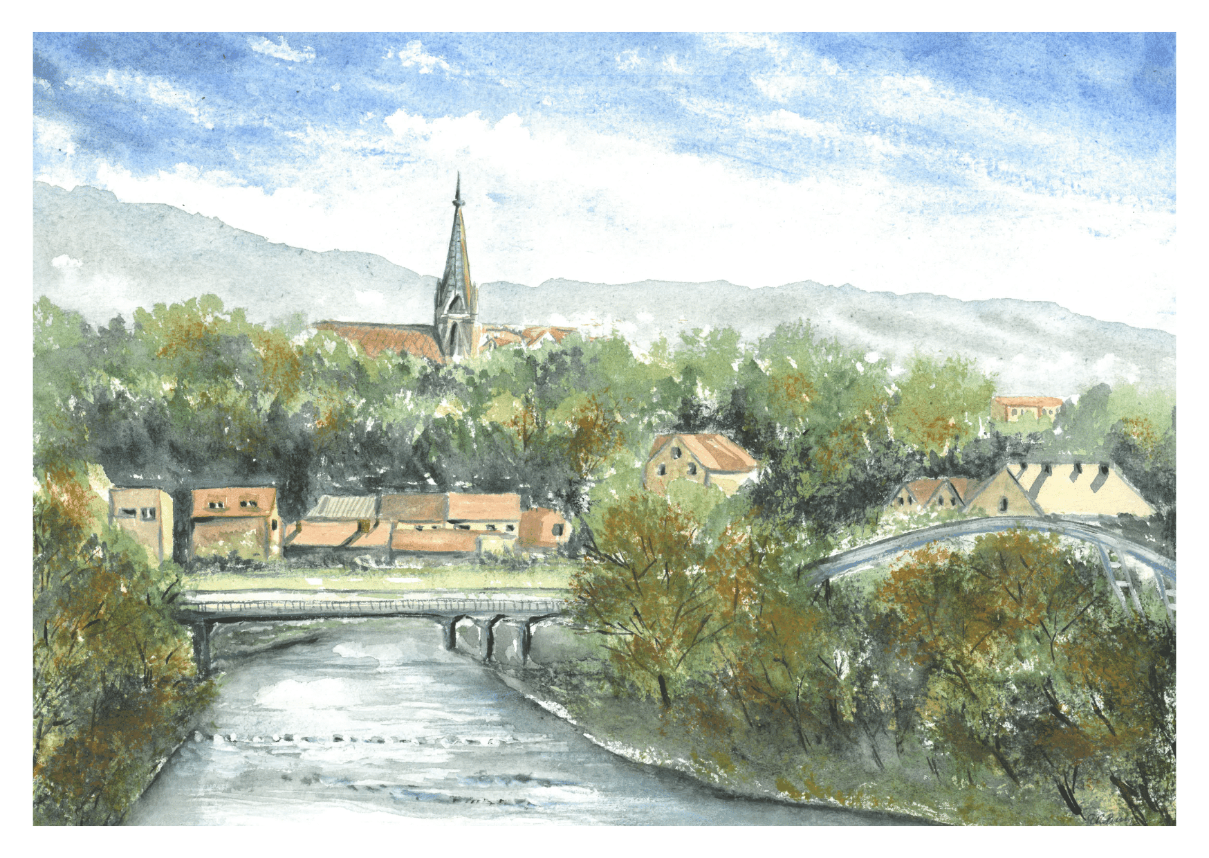 Wyjątkowa pocztówka z akwarelą Ewy Reciak-Bury przedstawiająca widok na Suchą Beskidzką ze zbocza Mioduszyny.